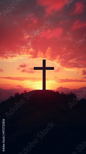 A cross atop the hill with a beautiful sunrise in the background, an Easter-themed background with copy space for text
