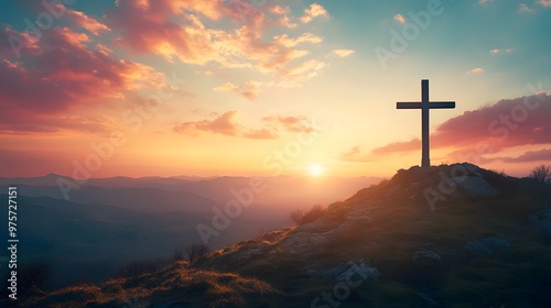 A cross atop the hill with a beautiful sunrise in the background, an Easter-themed background with copy space for text