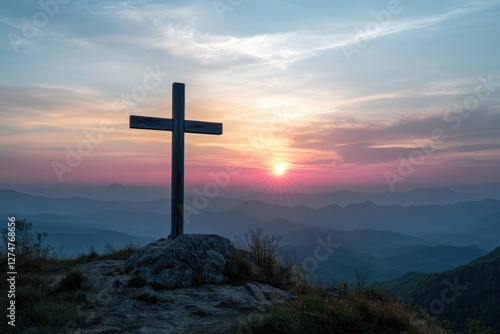 A cross atop the mountain with a sunset in the background An Easter and Christian concept Generative AI