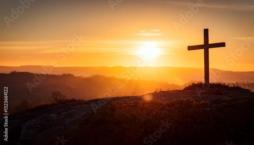 A cross on a hill, illuminated by the rising sun, symbolizing the Resurrection. The serene scene evokes hope, renewal, and the powerful message of faith and new beginnings.