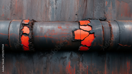 A cross-section of a corroded pipeline in an industrial plant, showing visible internal damage and active leakage, highlighted with red markers.