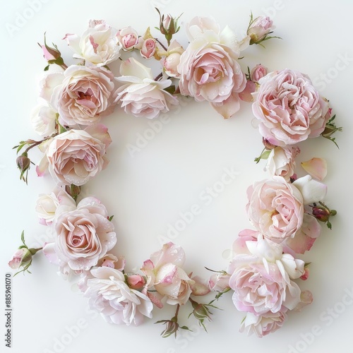 A crown of pale pink roses, their petals kissed with morning dew, creates a soft and romantic frame on the pristine white backdrop
