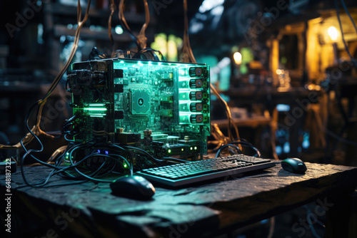 A crypto miner's computer setup working to validate blockchain transactions. Generative Ai.