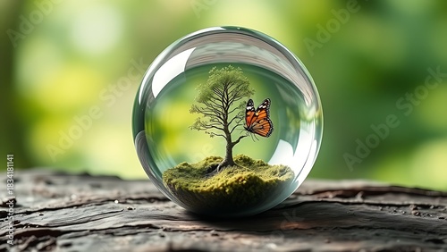 A crystal sphere containing a miniature tree, accompanied by a floating butterfly, symbolizing harmony with nature.