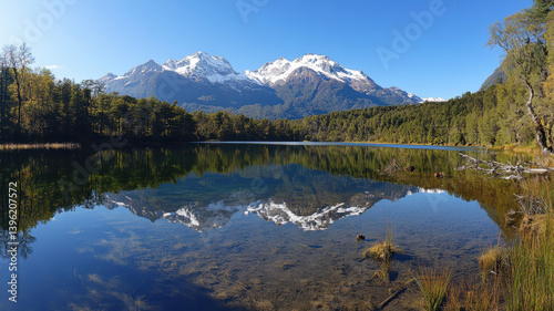 A crystal-clear natural lake surrounded by dense forests and snow-capped mountains, reflecting the sky in its untouched purity