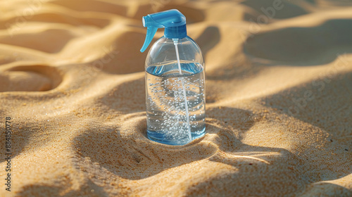 A crystal-clear water spray bottle with a blue trigger sprayer lying on a sandy beige background, with soft light reflections.