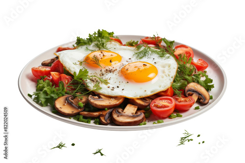 A Culinary Delight: White Plate With Mushroom Magic and Egg Extravaganza on a Clear PNG or White Background.