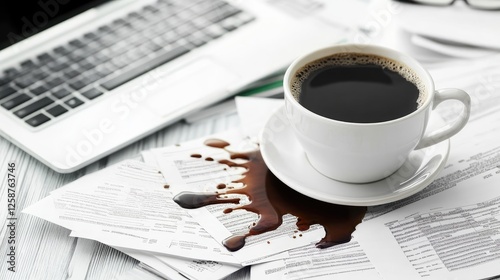 A cup of black coffee spills onto a laptop and paperwork, symbolizing workplace accidents.