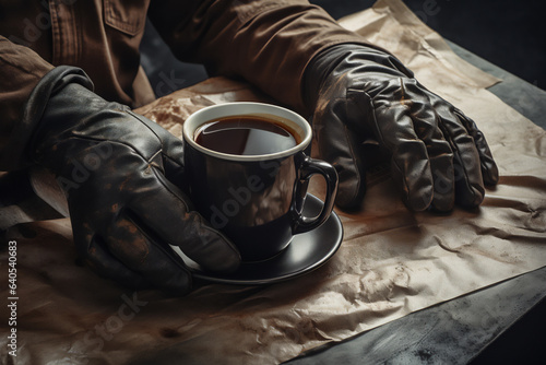 a cup of coffee in flat lay angle, hyper realistic, beautiful dreammy light, coffee beans background, created using generative AI tools