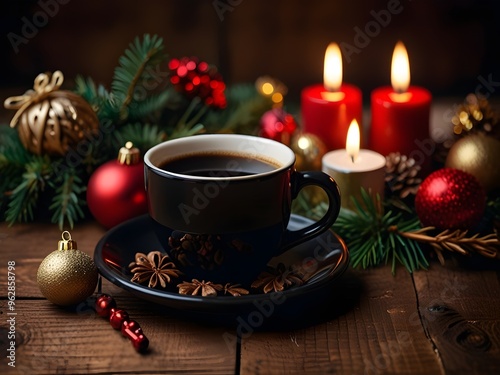 A Cup of Coffee on a Wooden Table with Christmas Decorations - Perfect for Coffee Shops, Home Decor, and Christmas Gifts