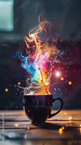A cup of coffee with a colorful flame on top