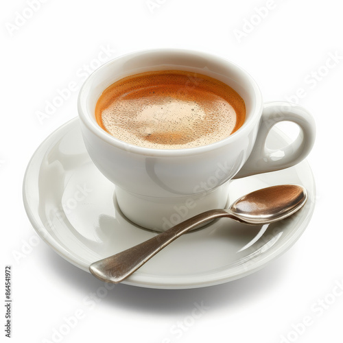 A cup of espresso with a small spoon on the saucer, isolated on white background