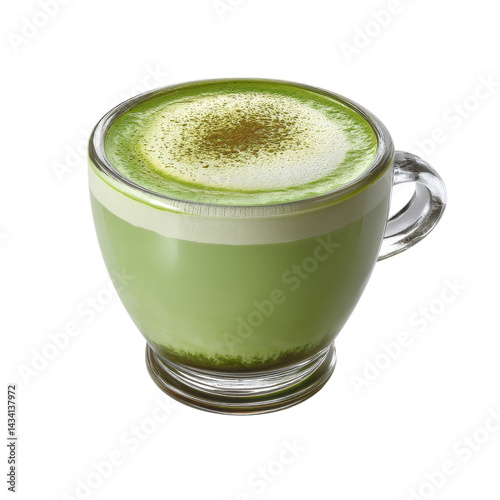A cup of frothy green matcha with a creamy layer, showcasing its vibrant color and smooth texture.