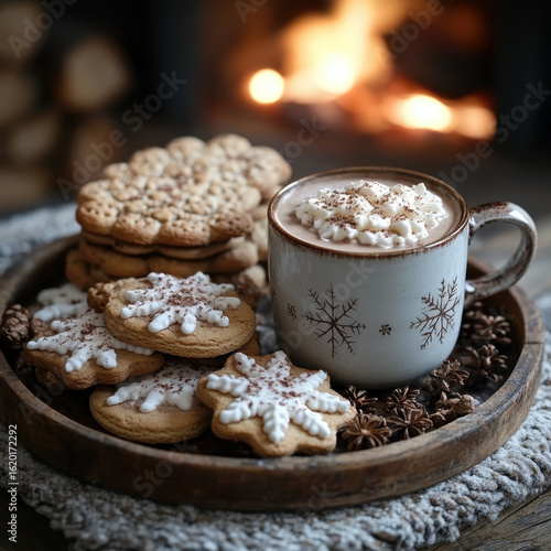 A cup of hot chocolate and cookies on a plate.
