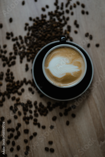 A cup of latte coffee on the table stands in coffee beans close-up