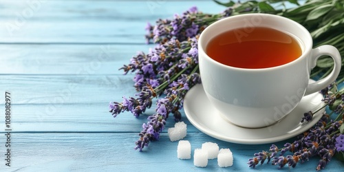 A cup of lavender tea accompanied by a bundle of fresh flowers, syrup, and sugar candy on a blue wooden table background.