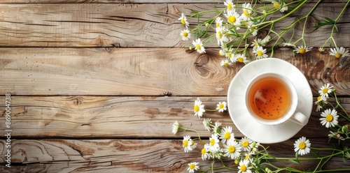 A cup of tea is sitting on a wooden table. Concept Still life photography, Chamomile tea, Rustic background, Daisies, Herbal and natural themes