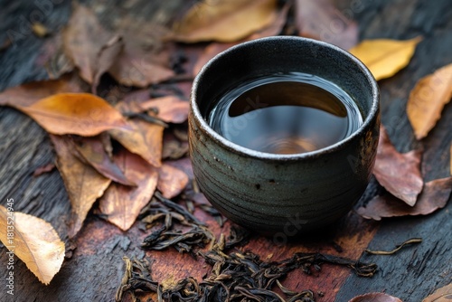 A cup of tea sits on a wooden table surrounded by autumn leaves, with a serene and contemplative atmosphere.