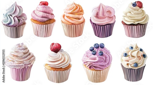 a cupcake collection, assorted festival treats, vector art style, soft pastel hues, isolated on white background