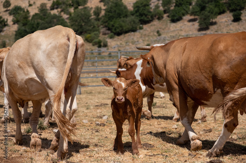 A curious and cute cute calf looking at the camera. Herd of grazing cows on a summer pasture. Dairy farming on natural pastures.