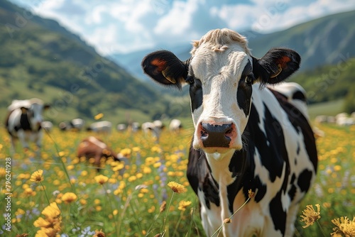 A curious cow with a sharp focus stands out against a blurred mountainous landscape and other cows
