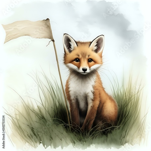 A Curious Fox Kit and a Blank Flag in Watercolor