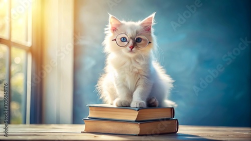 A Curious Kitten Perched on Books, Wearing Round Glasses and Gazing with Bright Blue Eyes