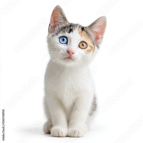 A curious kitten with heterochromia sitting against a plain background, showcasing its unique eyes