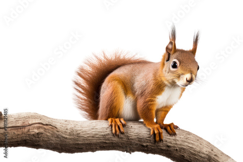 A curious red squirrel perched on a tree branch, its bushy tail elegantly fanned out, with bright eyes and alert posture, isolated on white background