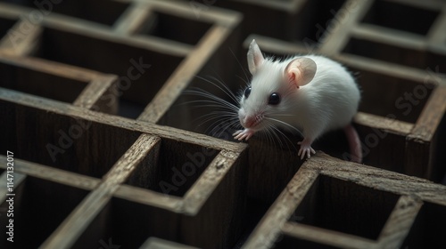 A curious white mouse explores a wooden grid, highlighting its inquisitive nature and delicate features.