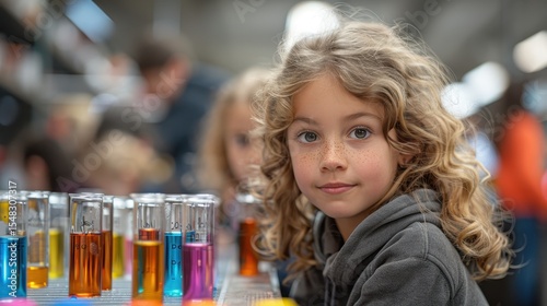 A curious young girl with curly hair looks at colorful test tubes, showcasing the joy of science and experimentation, embodying curiosity, playfulness, and discovery.
