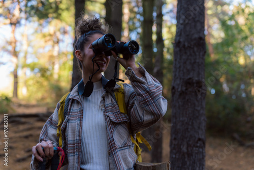A curly-haired forest wanderer, enjoying the serene atmosphere of an autumn forest trail, accompanied by her trusty binoculars.