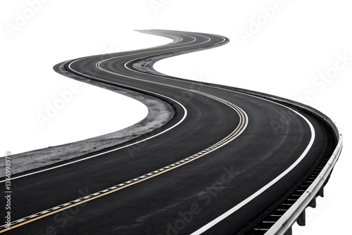 A curving asphalt road snakes into the distance, bordered by white guardrails and gravel shoulders. A metaphor for life’s journey, twists, and unknown destinations, isolated on transparent background
