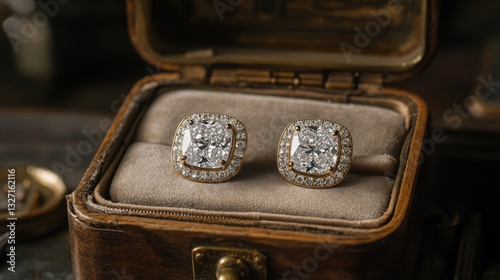 A cushion-cut diamond earring set placed in an antique wooden jewelry box