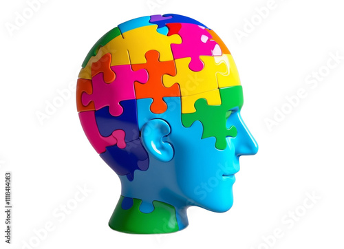 A cut out multicolored 3D render of a puzzle head for World Autism Awareness Day, world autism day concept. Transparent PNG white isolated background.