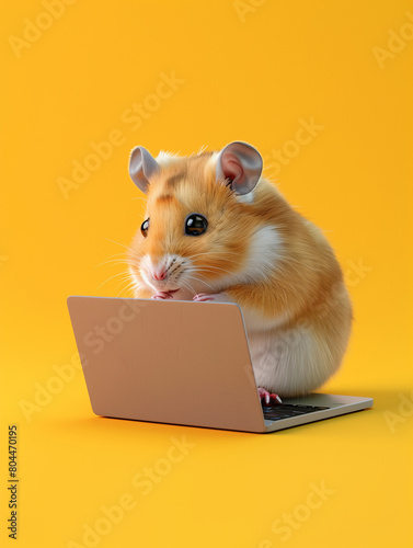A Cute 3D Hamster Using a Laptop Computer in a Solid Color Background Room