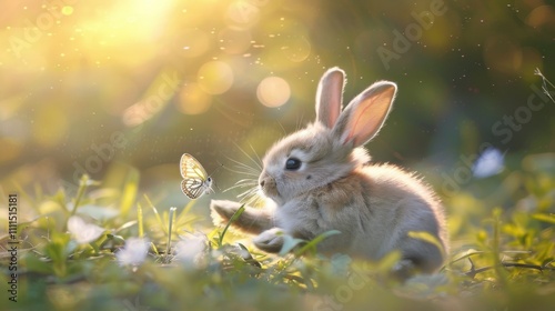 A cute, adorable baby rabbit gazing at a butterfly as it flies nearby, capturing a moment of innocence and natural beauty.
