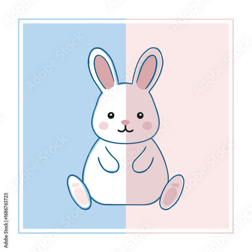A cute and sweet cartoon illustration of a fluffy white bunny on a split pink and blue background, a charming and gentle design for a baby shower or gender reveal.
