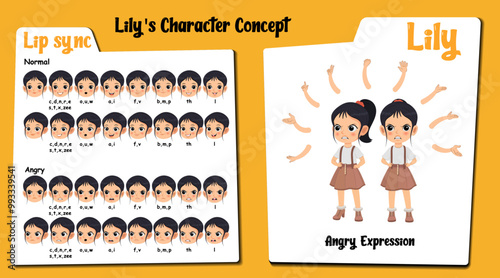 A cute angry girl cartoon character AKA Lily, Little cute girl cartoon character. Angry face expressions and lip sync. Set of cute girl with various hand gesture and front and 1/3 standing pose.