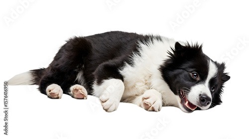 A cute black and white border collie dog lying down on a white background, appearing happy and relaxed with its mouth open
