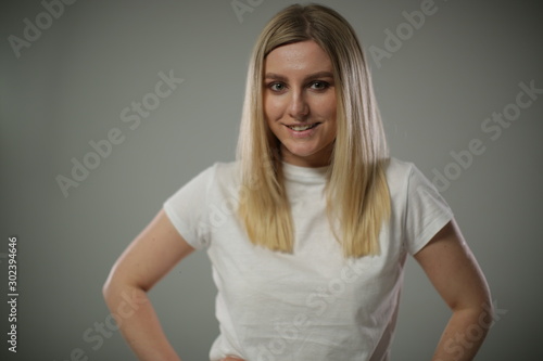 A cute blonde in a white t shirt stands