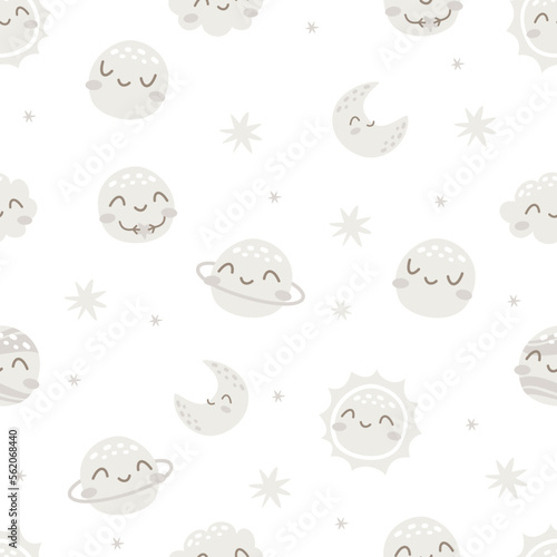 A cute bohemian pattern for the walls in a child's room. Seamless vector pattern. Cute planets with faces