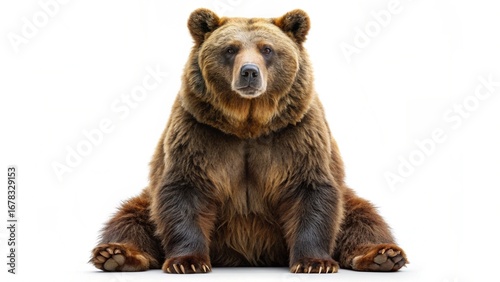 A cute brown bear cub with a wild, furry head is isolated on a white background