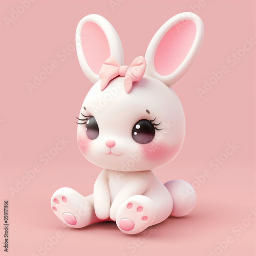 A cute bunny with big eyes and a bow, sitting on a pink background, exuding charm and sweetness, ideal for children's designs