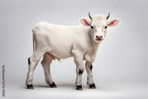 A cute calf with a soft white coat and tiny horns standing on a white background, AI Generated