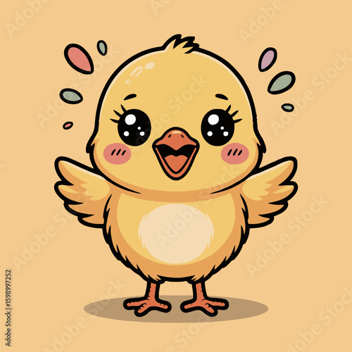 A cute cartoon chick with big eyes and open beak standing on a light orange colored background