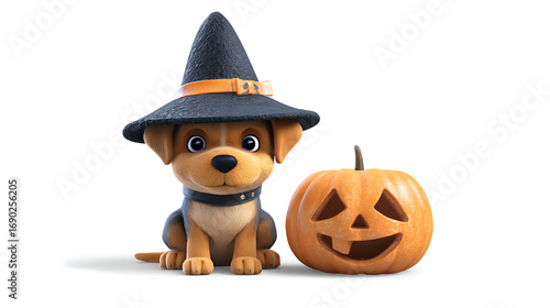 A cute cartoon dog wearing a witch hat sits beside a carved Halloween pumpkin, celebrating the festive season