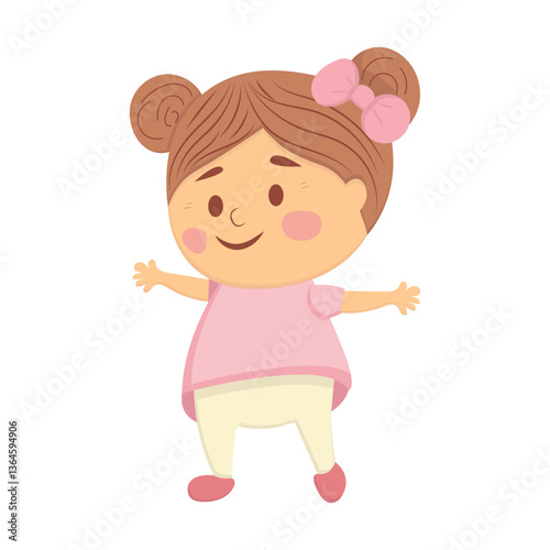 A cute cartoon girl with brown hair in two buns, adorned with a pink bow, wearing a pink shirt and beige pants, standing with arms outstretched against a white background.