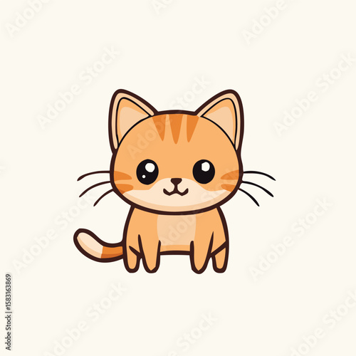 A cute cartoon orange tabby kitten stands against a cream colored background with stripes