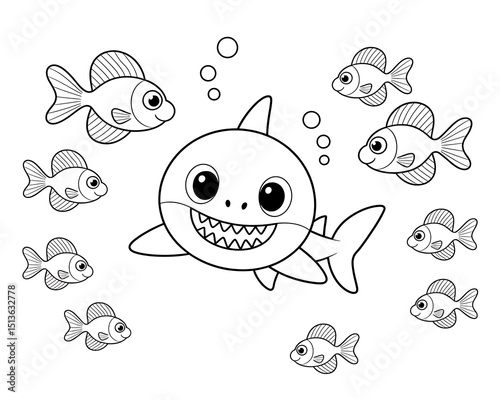 A cute cartoon shark character surrounded by cheerful fish in a monochrome outline perfect for coloring pages and children's design projects.